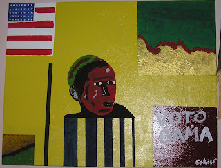 Du coup, j'en ai profité pour terminer un autre canevas que je mets en photo ici. J'avais terminé une toile à propos de la campagne qui appelait à voter Obama. Le Figaro-Web l'a même publiée comme l'oeuvre d un "artiste local appelant à soutenir le candidat noir". Pas mal tout de même de savoir que je suis désormais un artiste local.
